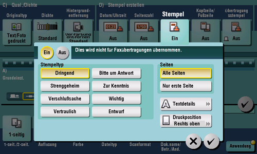 Tippen Sie auf [Ein], legen Sie Werte für [Stempeltyp] und [Seiten] fest und tippen Sie dann auf [OK].