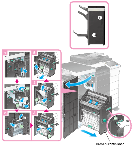 Fassen Sie den Broschürenfinisher beim Herausziehen nur am Griff an. Andernfalls könnten Sie mit Ihrer Hand oder einem Finger im System hängen bleiben.