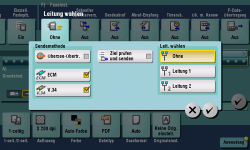 Geben Sie an, auf welcher Leitung das Fax mit welchen Einstellungen versendet werden soll.
