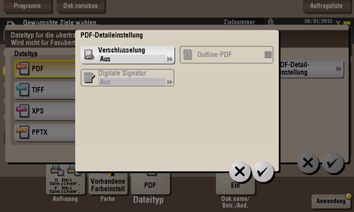 [Verschlüsselung] | Wählen Sie [Ein], um eine Datei zu verschlüsseln. Geben Sie ein Kennwort ein, um den Zugriff auf die Datei zu beschränken. Zum Festlegen von Berechtigungen für den Druck und die umfassende Bearbeitung von PDFs geben Sie ein Autorisierungskennwort ein und nehmen dann die gewünschten Einstellungen für [Verschlüss.niveau], [Druckberechtigungen], [Inhalt kopieren] und [Änderungen zulässig] vor. Ausführliche Informationen finden Sie Hier. |