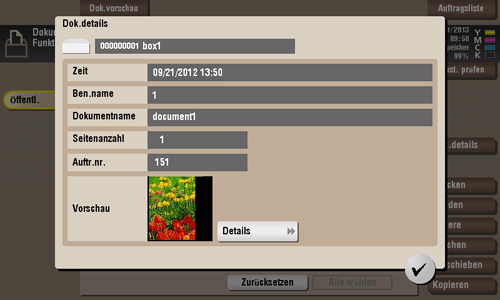 Sie können den Speicherzeitpunkt, die Seitenzahl und ein Vorschaubild der ausgewählten Datei abrufen.