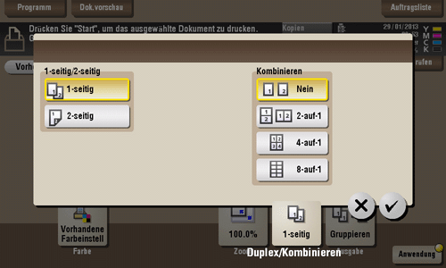 [1-seitig/2-seitig] | Das Original wird entweder auf eine oder auf beide Seiten des Papiers gedruckt. |