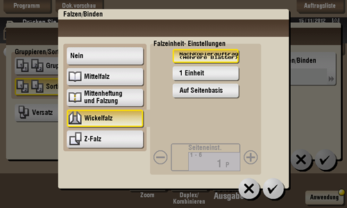 Das bedruckte Blatt wird vor der Ausgabe durch zwei Falze in drei gleiche Teile geteilt. Wählen Sie auch die Einheit für das Falzen des Papiers aus: [NachKopierauftrag (Mehrere Blätter)], [1 Einheit] oder [Auf Seitenbasis]. Wenn Sie [Auf Seitenbasis] auswählen, geben Sie die Anzahl der Seiten an, die gleichzeitig gefalzt werden sollen.
