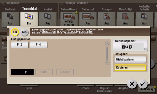 [Einfügeposition] | Legen Sie die Seitenzahl fest, an der ein anderes Blatt eingefügt werden soll.
