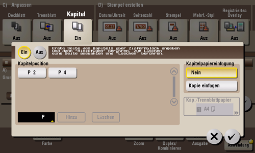 Bei Verwendung der Kapitelfunktion wird die Option [Duplex/Kombinieren] automatisch auf [2-seitig] gesetzt.
