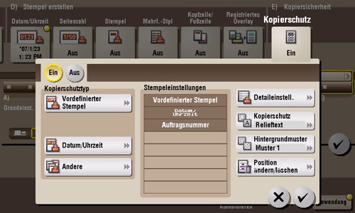 Legen Sie fest, wie das Kopierschutzmuster gedruckt werden soll. Bei Bedarf können Sie auch den Musterkontrast festlegen.