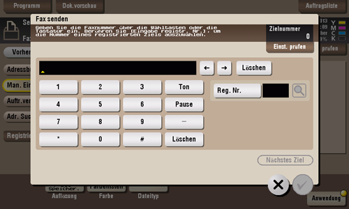 Geben Sie die Faxnummer des Empfängers ein, an den ein Fax gesendet werden soll. Wollen Sie noch mehr Ziele angeben, tippen Sie auf [Nächstes Ziel].