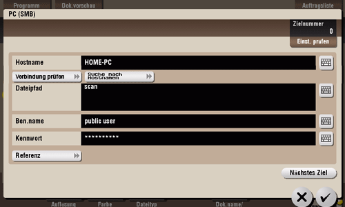 [Referenz] | Suchen Sie im Touch Display nach einem Ziel-Computer für den Dateiversand und wählen Sie einen freigegebenen Zielordner aus. Wenn der Authentifizierungsbildschirm angezeigt wird, geben Sie den Namen und das Kennwort eines Benutzers an, der die entsprechenden Rechte für den Zugriff auf den ausgewählten Ordner besitzt. Nach der Authentifizierung wird der [Hostname] oder der [Dateipfad] automatisch eingetragen. Unter den folgenden Bedingungen kann die Referenzfunktion fehlschlagen.
