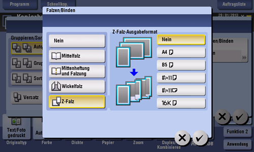 Zur Verwendung der Z-Falz-Funktion werden der Finisher FS-535 und die Z-Falz-Einheit ZU-606 benötigt (nur für bizhub C554e).