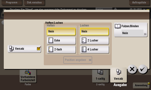 Wenn der Finisher oder die Zweifachablage JS-506 installiert ist, werden die gedruckten Blätter bei der Ausgabe übereinander gestapelt, wobei einzelne Kopien- oder Seitensätze versetzt abgelegt werden, um sie voneinander zu trennen.