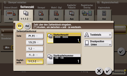 Geben Sie über die Tastatur die Startkapitelnummer ein, wenn ein Original in Kapitel unterteilt ist und Sie erst ab dem zweiten Kapitel oder später Seitenzahlen mit Kapitelnummer drucken möchten. Tippen Sie zur Anzeige der Tastatur auf den Eingabebereich für Zahlen. Sie können Seitenzahlen mit Kapitelnummern nur angeben, wenn Sie unter [Seitenzahlenformat] die Option [Kapitelseite] ausgewählt haben. Geben Sie zum Beispiel für den Druck von Kapitelnummern ab dem dritten Kapitel "-1" ein. Das erste Kapitel der Datei wird als "-1", das zweite Kapitel als "0" und das dritte Kapitel als "1" gezählt. Unter [Startkapitelnummer] wird festgelegt, dass die Kapitelnummer für die Kapitel gedruckt wird, die als 1 und höher gezählt werden. Wenn "2" eingegeben wird, wird die Nummer ab der ersten Seite des ersten Kapitels der Datei in der Form "2-1, 2-2" gedruckt. "-" (Minuszeichen) wechselt bei jedem Tippen auf [*] zu +.