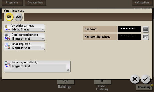 Zum Festlegen von Berechtigungen für den Druck und die Bearbeitung einer PDF-Datei geben Sie ein Autorisierungskennwort ein.