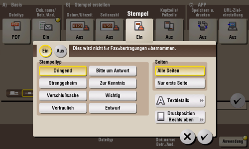 Text, wie z. B. "Bitte um Antwort" oder "Verschlusssache", kann auf der ersten Seite oder auf allen Seiten gedruckt werden. Sie können den zu druckenden Text aus den registrierten festen Stempeln und den eigenen registrierten Stempeln auswählen.