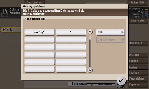 Speichern Sie eine Datei als Overlay-Bild. Nach der Registrierung können Sie während des Kopierens oder Druckens ein Overlay-Bild auf dem Original erstellen.