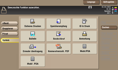 [Bulletin] | Mehrere Faxdokumente, die für den Abruf bestimmt sind, können in der Bulletin-Board-Box gespeichert werden. Es können maximal 10 Bulletin-Board-Boxen erstellt und registriert werden. Nachdem Sie die Box geöffnet haben, können Sie ein in der Box gespeichertes Faxdokument auswählen und dieses anzeigen, ausdrucken oder löschen. Wenn Ankündigungen und andere Faxdokumente in der Bulletin-Board-Box abgelegt wurden und den Empfängern die entsprechenden Boxnummern mitgeteilt werden, können die Benutzer die benötigten Faxdokumente auswählen und abrufen. Zur Verwendung dieser Funktion wird das optionale Fax-Kit auf diesem System benötigt. |