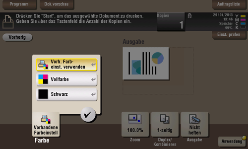 [Vorh. Farbeinst. verwenden] | Druckt eine Datei in dem bei der Speicherung verwendeten Farbmodus. |