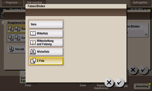 • Zur Verwendung der Z-Falz-Funktion werden der Finisher FS-535 und die Z-Falz-Einheit ZU-606 benötigt (nur für bizhub C554e).