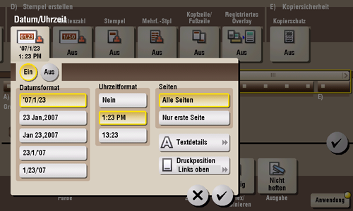 Sie können eine Druckposition und das Format auswählen und das Datum und die Uhrzeit einfügen. Datum und Uhrzeit können entweder auf allen Seiten oder nur auf der ersten Seite gedruckt werden.