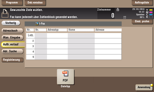 Tippen Sie auf [Auftr.verlauf], um ein Ziel aus dem Scan- oder Faxverlauf auszuwählen. Die letzten Aufträge (max. 5) werden im Verlauf angezeigt. Bei Bedarf können mehrere Ziele aus dem Verlauf ausgewählt werden.