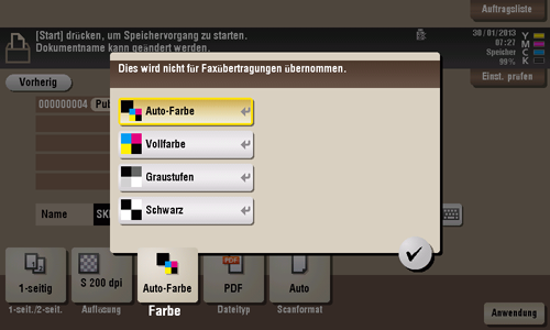 [Auto-Farbe] | Beim Scannen wird in Abhängigkeit von der Originalfarbe automatisch entweder [Vollfarbe] oder [Graustufen] ausgewählt. |