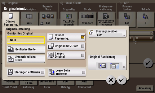 Diese Funktion verringert die Transportgeschwindigkeit des Originals im ADF, um beim Scannen eines Originals, das dünner als Normalpapier ist, einen Fehleinzug des Originals zu verhindern.