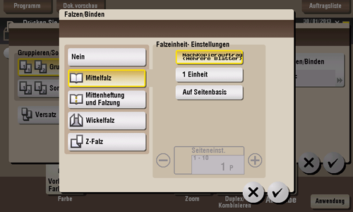 Ein gedrucktes Blatt wird vor der Ausgabe in der Mitte gefalzt. Wählen Sie auch die Einheit für das Falzen des Papiers aus: [NachKopierauftrag (Mehrere Blätter)], [1 Einheit] oder [Auf Seitenbasis]. Wenn Sie [Auf Seitenbasis] auswählen, geben Sie die Anzahl der Seiten an, die gleichzeitig gefalzt werden sollen.