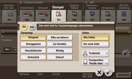 Text, wie z. B. "Bitte um Antwort" oder "Verschlusssache", kann auf der ersten Seite oder auf allen Seiten gedruckt werden. Sie können den zu druckenden Text aus den registrierten festen Stempeln und den eigenen registrierten Stempeln auswählen.