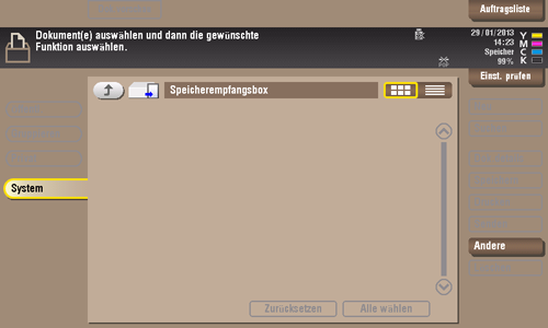 Wenn das Empfängersystem belegt ist und keine Verbindung hergestellt werden kann, werden unzustellbare Faxdokumente in der Box für die erneute Faxübertragung abgelegt. Nachdem Sie die Box geöffnet haben, können Sie ein in der Box gespeichertes Faxdokument auswählen und dieses anzeigen, ausdrucken, senden oder löschen.
