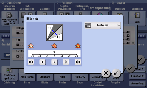 [Testkopie] | Sie können die Ausgabe überprüfen, indem Sie eine Testkopie drucken. Legen Sie das Original auf das Vorlagenglas auf. Tippen Sie dann auf [OK] oder drücken Sie auf Start. |