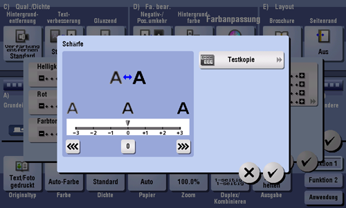[Testkopie] | Sie können die Ausgabe überprüfen, indem Sie eine Testkopie drucken. Legen Sie das Original auf das Vorlagenglas auf. Tippen Sie dann auf [OK] oder drücken Sie auf Start. |