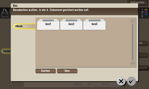 [Neu] | Eine Box wird erstellt. Geben Sie über das Tastenfeld die Nummer der Box ein, die Sie registrieren möchten, und tippen Sie auf [OK]. Tippen Sie zur Anzeige der Tastatur auf den Eingabebereich für Zahlen. Der Ort, an dem die Box erstellt wird, kann in Abhängigkeit vom Anmeldestatus des Benutzers unterschiedlich sein.