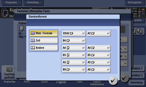 [Metr. Formate] | Wenn Sie Papier mit einem metrischen Format in die Stapelblattanlage einlegen, wählen Sie das Papierformat aus. |