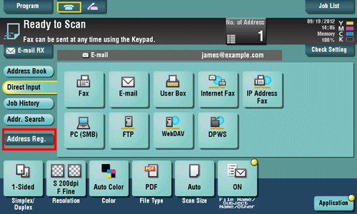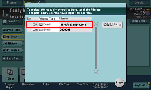 When a fax transmission to the destination which is specified by direct input is complete, tap [Address Book] and check that the destination is registered.