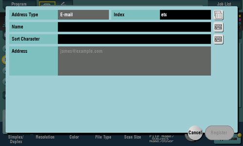 [Sort Character] | Enter the same name as the registered name (using up to 24 characters). You can sort destinations by registration name. |