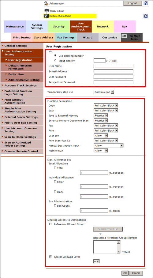 [Max. Allowance Set] | Sets the maximum number of sheets the user can print and User Boxes they can register. For details, refer to Here. |