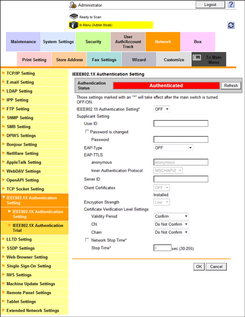 In the administrator mode, select [Network] - [IEEE802.1X Authentication Setting] - [IEEE802.1X Authentication Trial] to confirm the current authentication status. The authentication process can be activated for the authentication server.