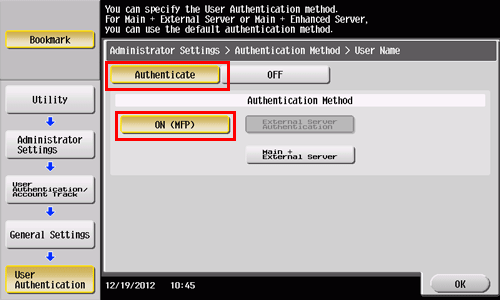 Set [Authentication Method] to [ON (MFP)], then tap [OK].