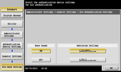 Tap [Authentication Device Settings] - [General Settings] - [Bio Authentication], and configure the following setting.