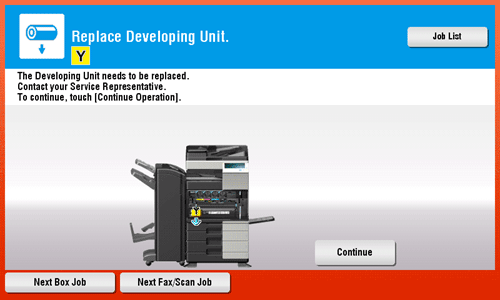 When the replacement time has come for the Developing Unit, the following message appears. If the message appears, contact your service representative.