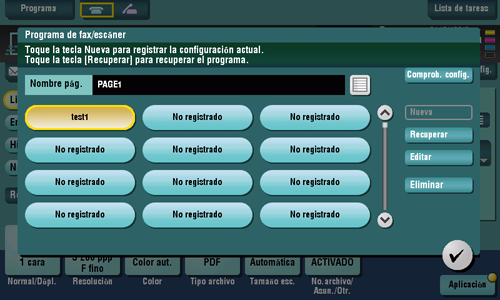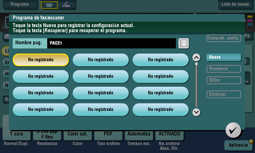 Programa es una función que se utiliza para registrar una combinación de configuraciones de opciones de uso frecuente como una tecla de recuperación. El programa que se registrará en el modo fax/escáner se denomina programa de fax/escáner.