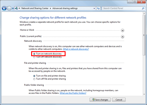 Antes de la instalación, en el menú Inicio, seleccione [Panel de control] - [Redes e Internet] - [Centro de redes y recursos compartidos] - [Configuración de uso compartido avanzado] y compruebe que la opción [Detección de redes] esté activada.