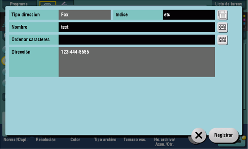 [Ordenar caracteres] | Introduzca el mismo nombre como nombre registrado (utilizando 24 caracteres como máximo). Los números de fax se pueden ordenar por nombre. |