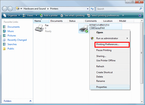 En Windows 7/8/8.1/Server 2008 R2/Server 2012/Server 2012 R2, haga clic con el botón derecho en el icono de la impresora instalada y, en [Preferencias de impresión], haga clic en el nombre de impresora que se muestra.