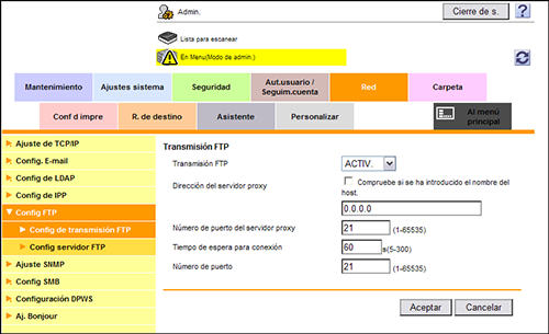 [Transmisión FTP] | Seleccione [ACTIV.] para utilizar la función de transmisión FTP. [ACTIV.] es la opción predeterminada. |