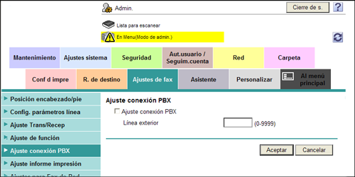 En el modo Administrador, seleccione [Ajustes de fax] - [Ajuste conexión PBX] y, a continuación, configure las siguientes opciones.
