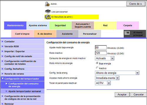 En el modo Administrador, seleccione [Mantenimiento] - [Configuración del temporizador] - [Configuración del consumo de energía] y, a continuación, configure las siguientes opciones.