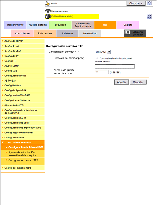 En el modo Administrador, seleccione [Red] - [Conf. actual. Máquina] - [Configuración de Internet ISW] - [Configuración servidor FTP] y, a continuación, establezca la siguiente configuración.