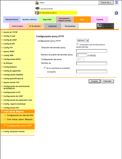 En el modo Administrador, seleccione [Red] - [Conf. actual. Máquina] - [Configuración proxy HTTP] y, a continuación, establezca la siguiente configuración.