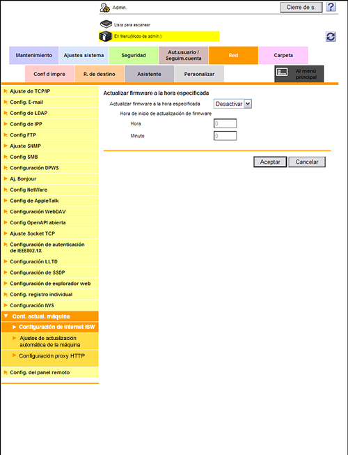 En el modo Administrador, seleccione [Red] - [Conf. actual. Máquina] - [Configuración de Internet ISW] - [Parámetros de la actualización de firmware] y, a continuación, configure las siguientes opciones.