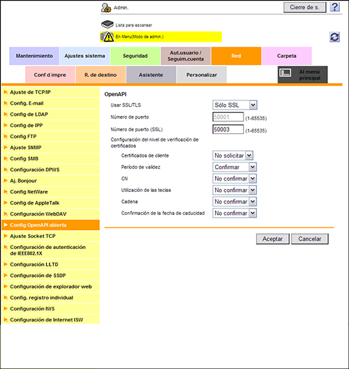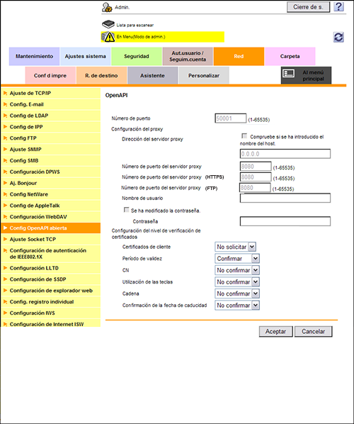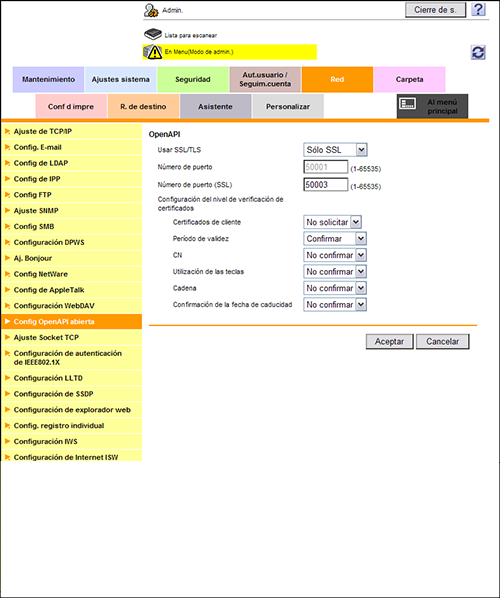 En el modo Administrador, seleccione [Red] - [Config OpenAPI abierta] y, a continuación, configure las siguientes opciones.